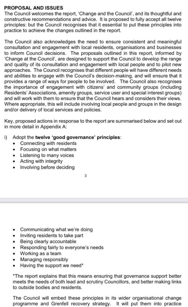 In 2017, following the Grenfell Tower fire, RBKC commissioned a publicly-funded review by the Centre for Governance and Scrutiny that produced policy recommendations that were adopted by the council and formed the basis of what was, in theory, to be a fundamental change of approach. Underpinning it all were the Twelve Principles of good Governance. The council’s leadership were to be held to account on their adherence to their 12 Principles by RBKC’s Executive and Corporate Services Scrutiny Committee.