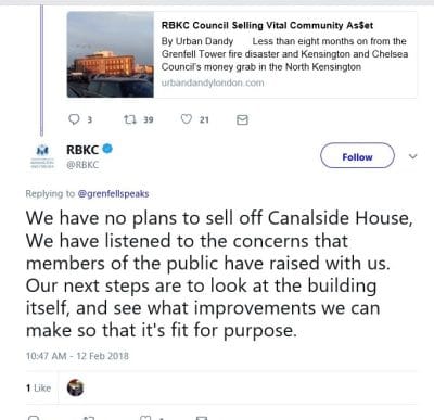 2018: Without consultation, the council revives its plans to sell, revealed in an executive decision document during a scrutiny committee meeting at the Town Hall. The section on Canalside House can be viewed from 2:01 in this Grenfell Speaks video.